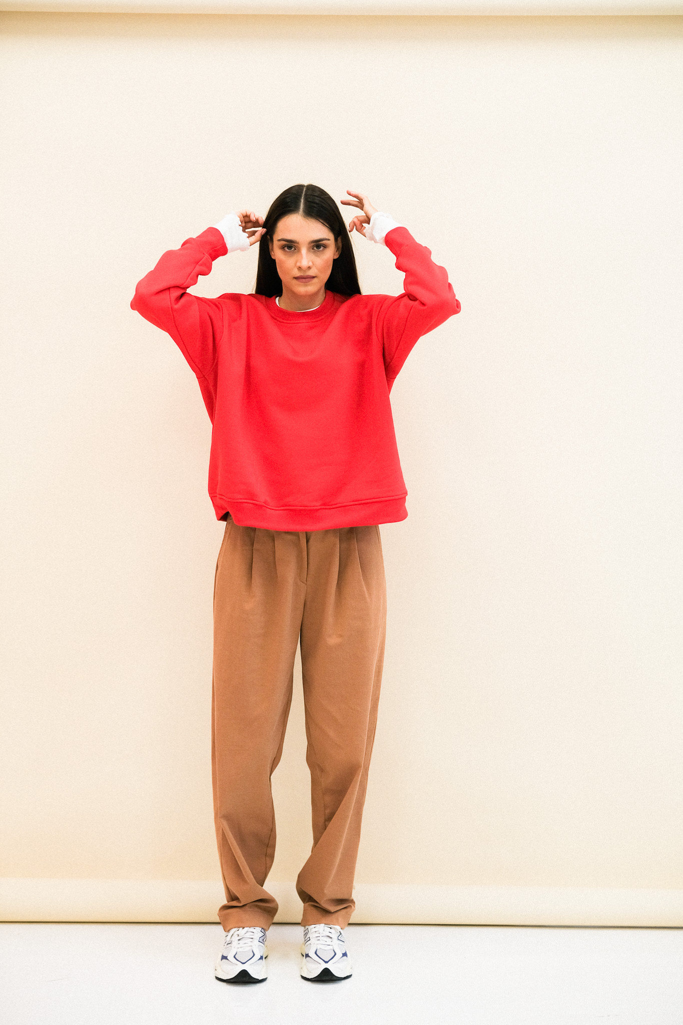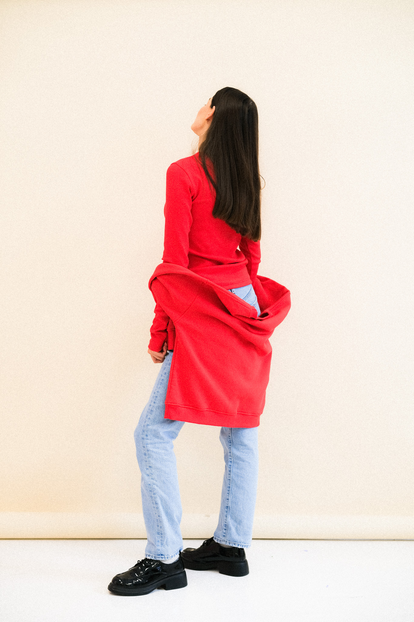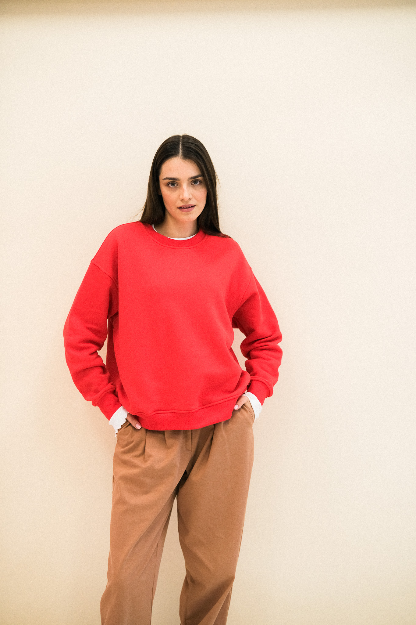 Delikatnie oversizowa bluza CHERRI, uszyta jest z jakościowej dresówki, z misiem w środku. Materiał jest mięsisty i pięknie trzyma formę. Bluza wykończona jest ściągaczem. Bluza jest totalnie klasyczna, ale ten kolor z pewnością Cię urzeknie. Ciepła, soczysta czerwień idealnie skomponuje się z brązami i jeansami. Zobacz też nasz nowy longsleeve hide classic w tym samym kolorze.