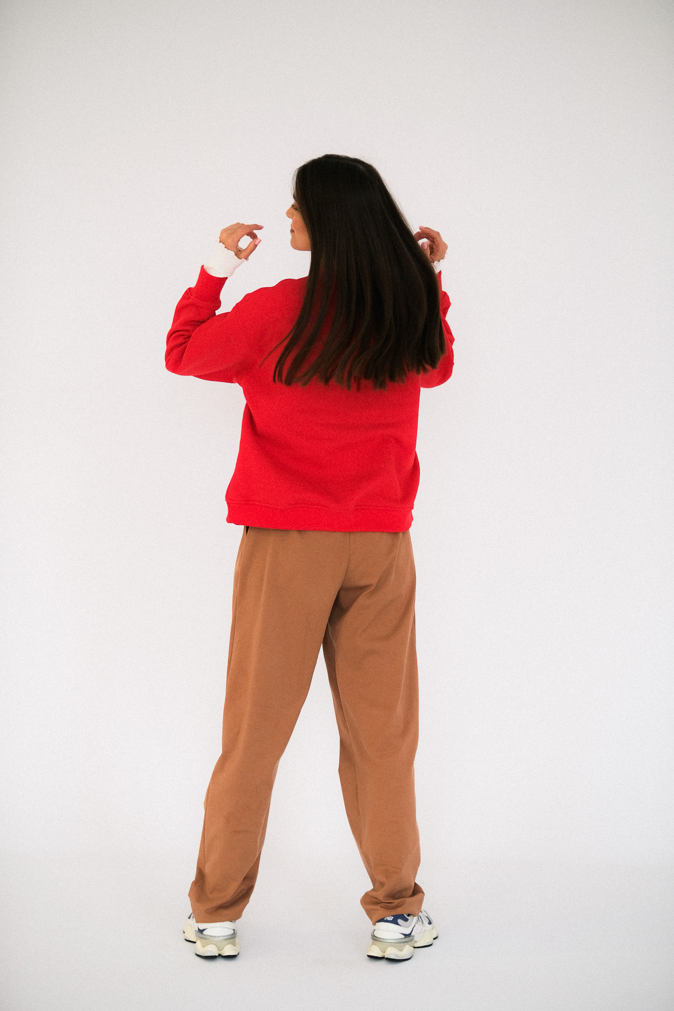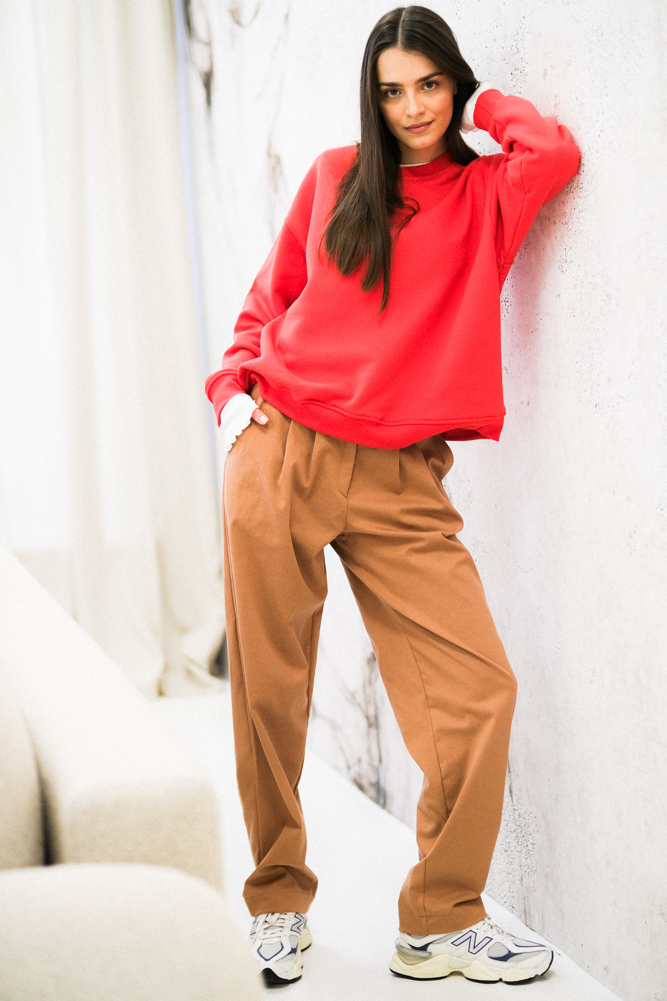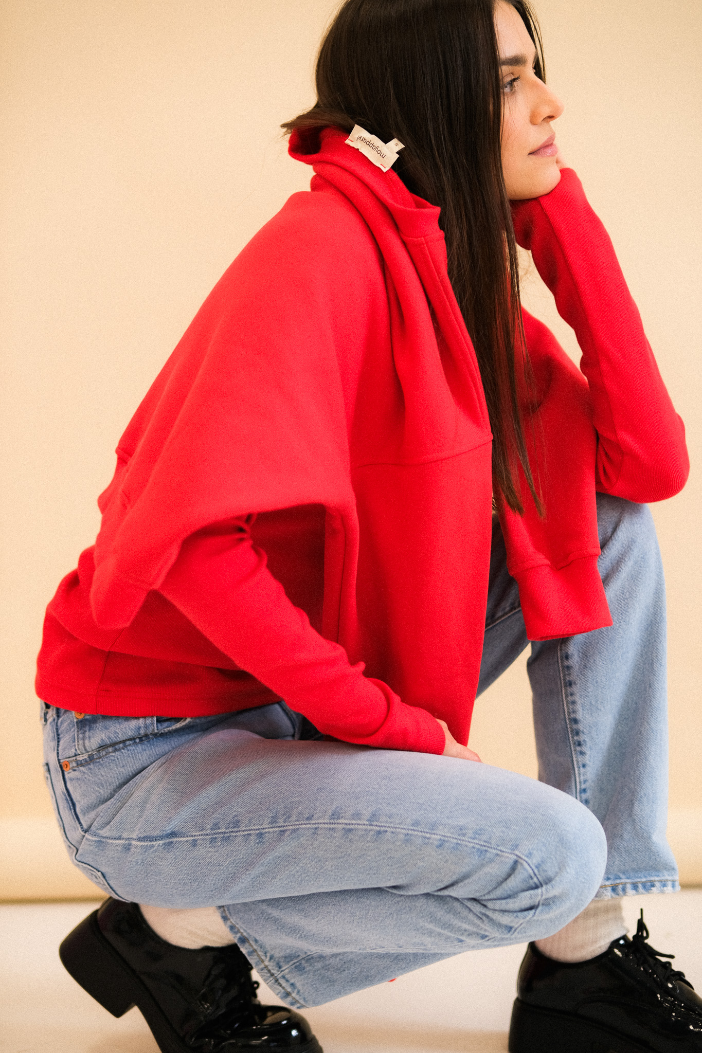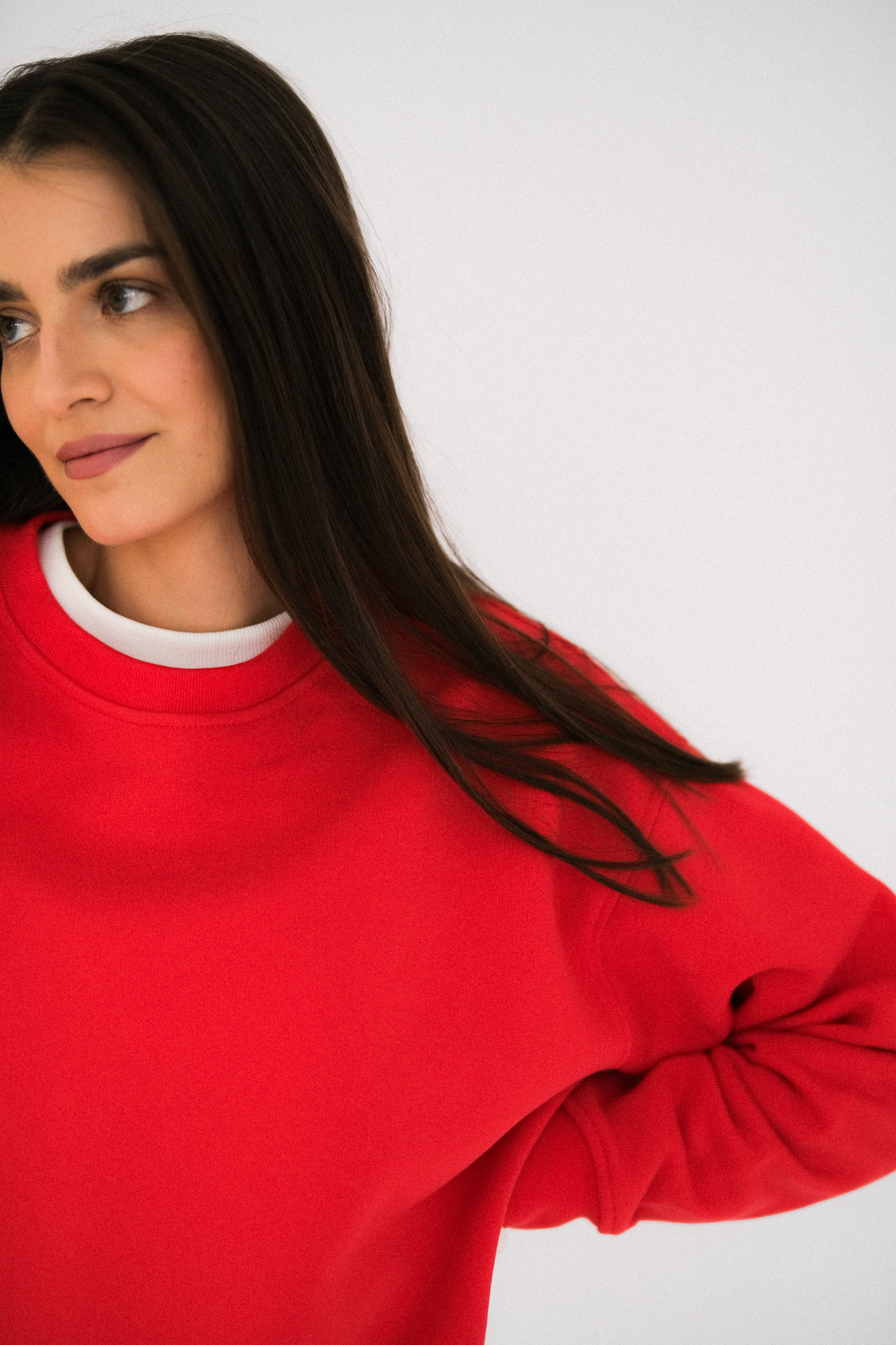 Delikatnie oversizowa bluza CHERRI, uszyta jest z jakościowej dresówki, z misiem w środku. Materiał jest mięsisty i pięknie trzyma formę. Bluza wykończona jest ściągaczem. Bluza jest totalnie klasyczna, ale ten kolor z pewnością Cię urzeknie. Ciepła, soczysta czerwień idealnie skomponuje się z brązami i jeansami. Zobacz też nasz nowy longsleeve hide classic w tym samym kolorze.