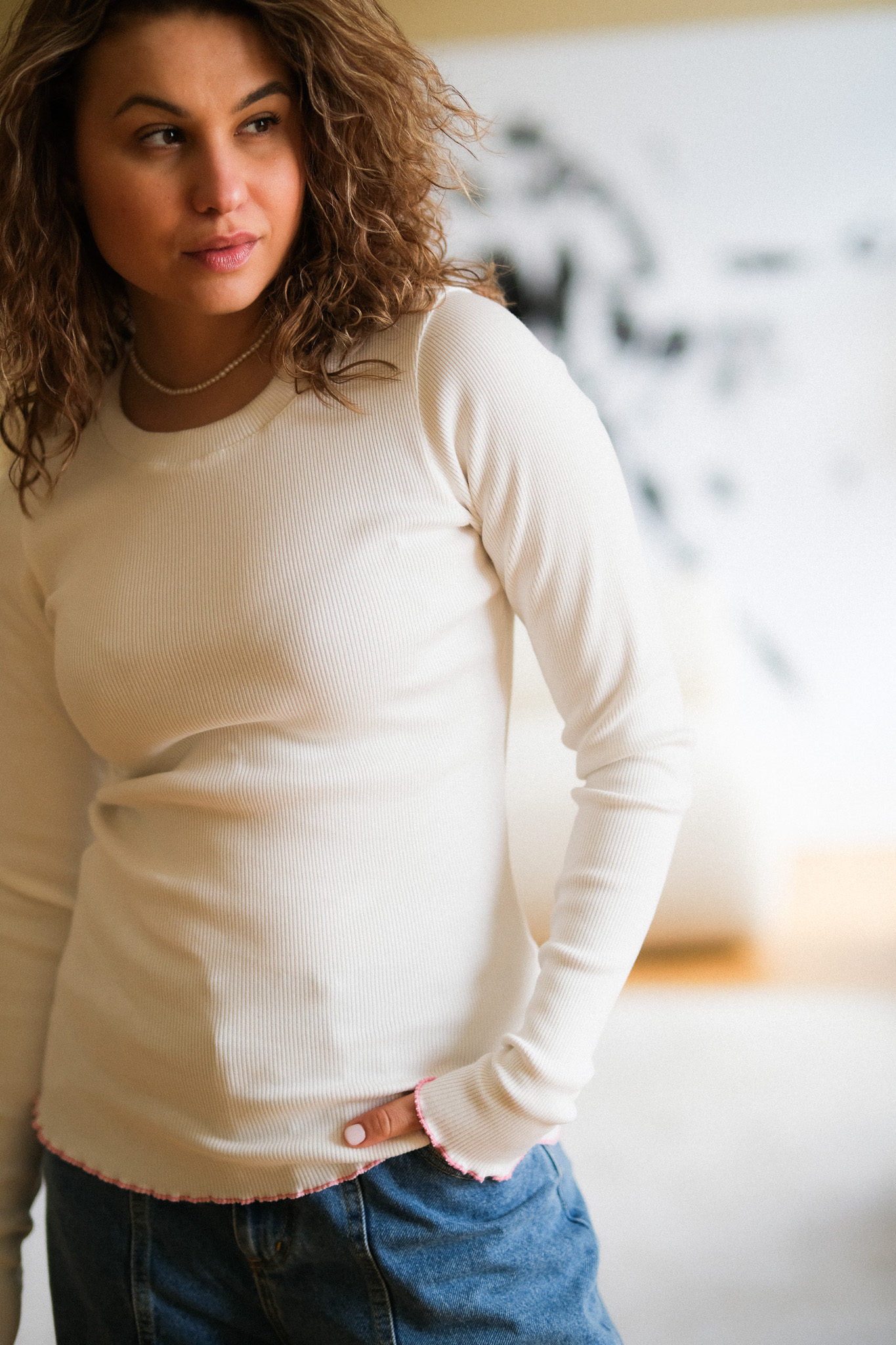 Ponadczasowy longsleeve, wykonany z prążkowanej bawełny, z dodatkiem elastanu co sprawia, że świetnie przylega do ciała, pięknie podkreślając kształty I dopasowując się do sylwetki. Materiał jest gruby, mięsisty, idealny na chłodniejsze miesiące, ale nosimy go tak naprawdę cały rok. Możesz go założyć do marynarki, jako dodatkowe ocieplenie pod bluzę, lub po prostu z jeansami. Rękawy są przydługie co dodaje kobiecości i niepowtarzalności.