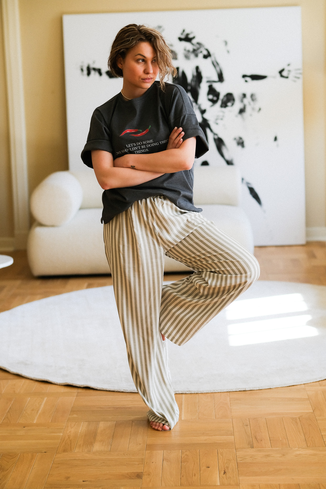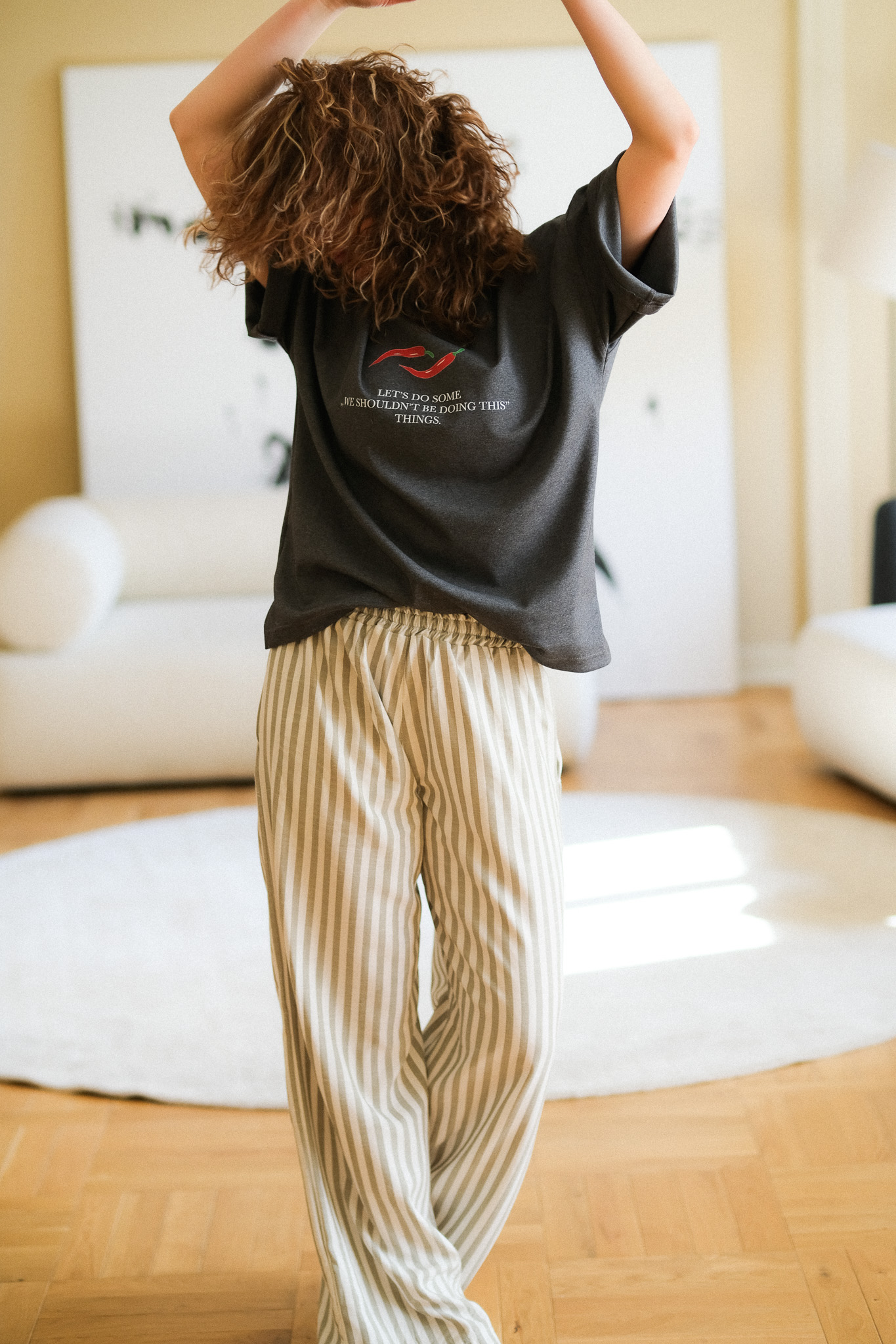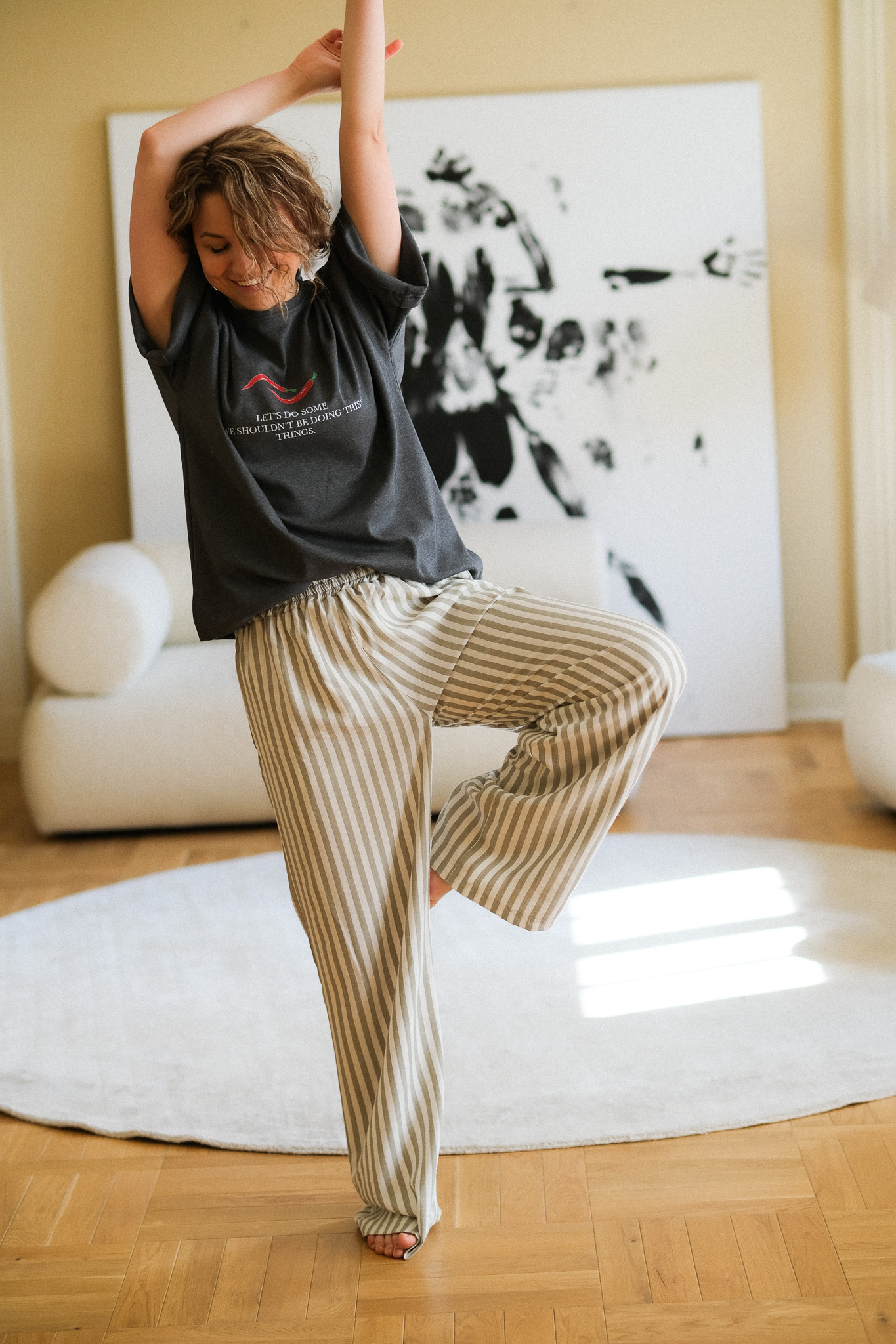 Szeroki, elastyczny pas (guma) sprawia, że spodnie dopasowują się do talii, zapewniając wygodę przez cały dzień – od porannej kawy po wieczorny spacer. Materiał o naturalnym splocie świetnie przepuszcza powietrze, co czyni je idealnym wyborem na cieplejsze dni.