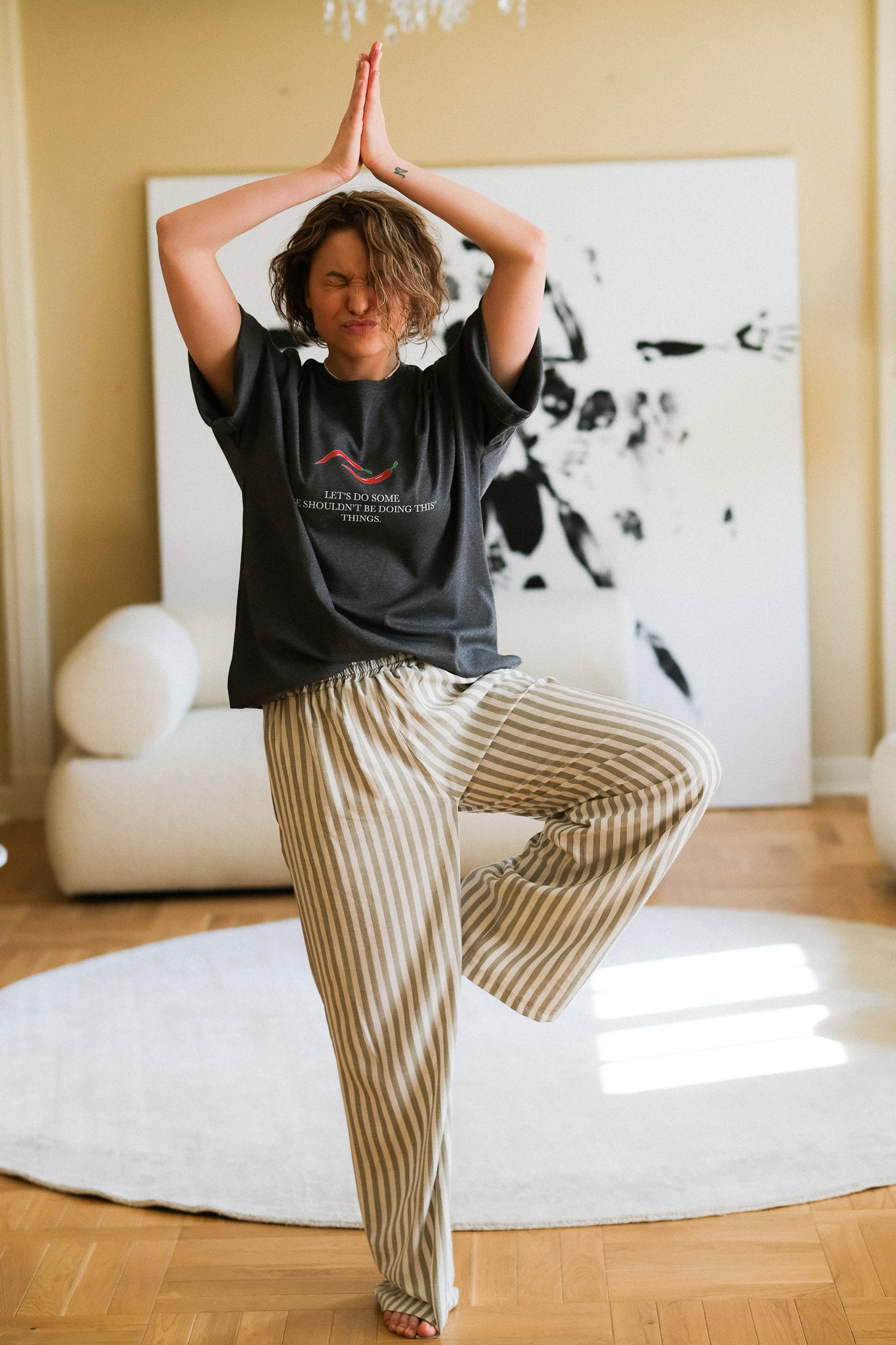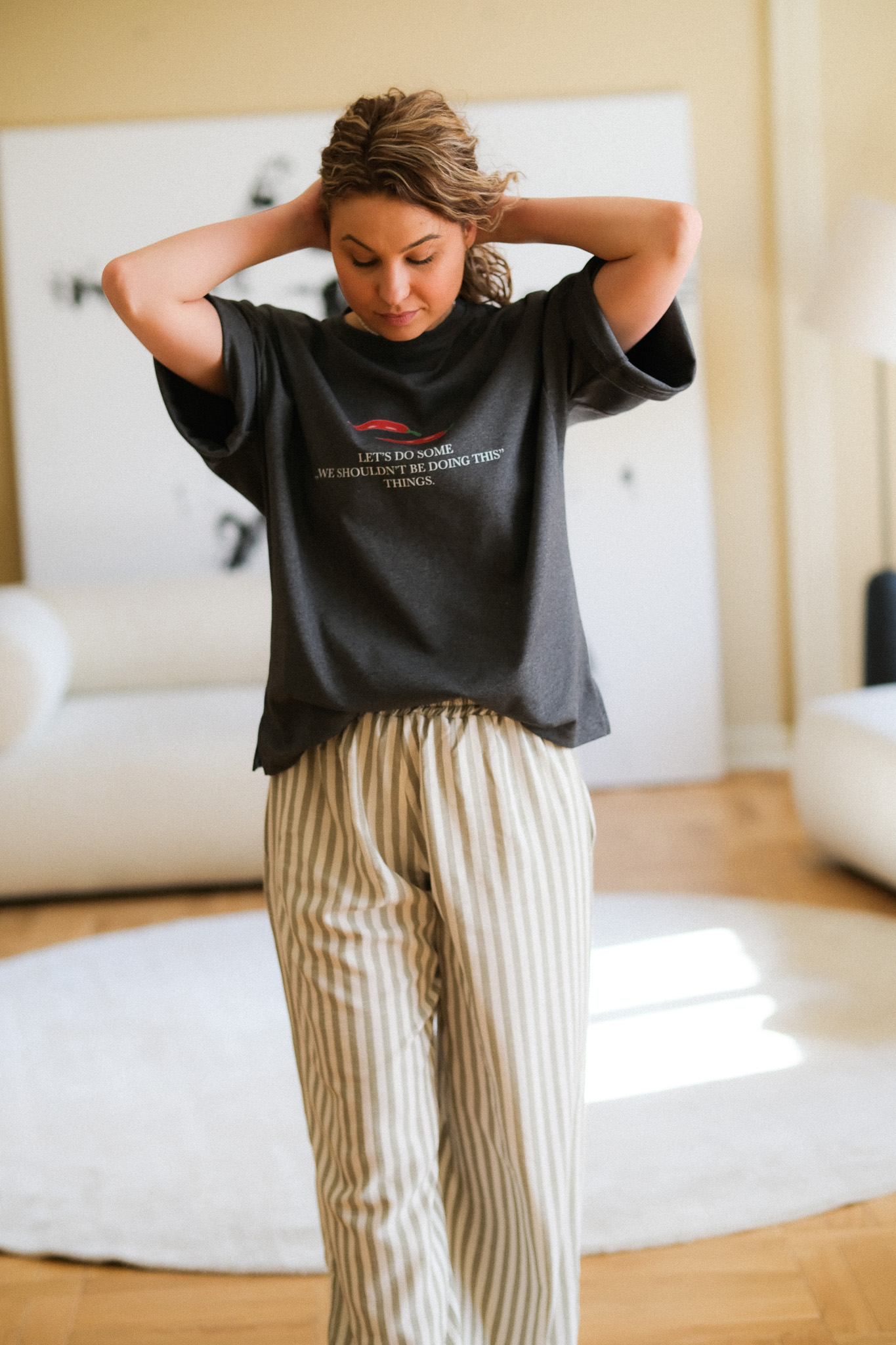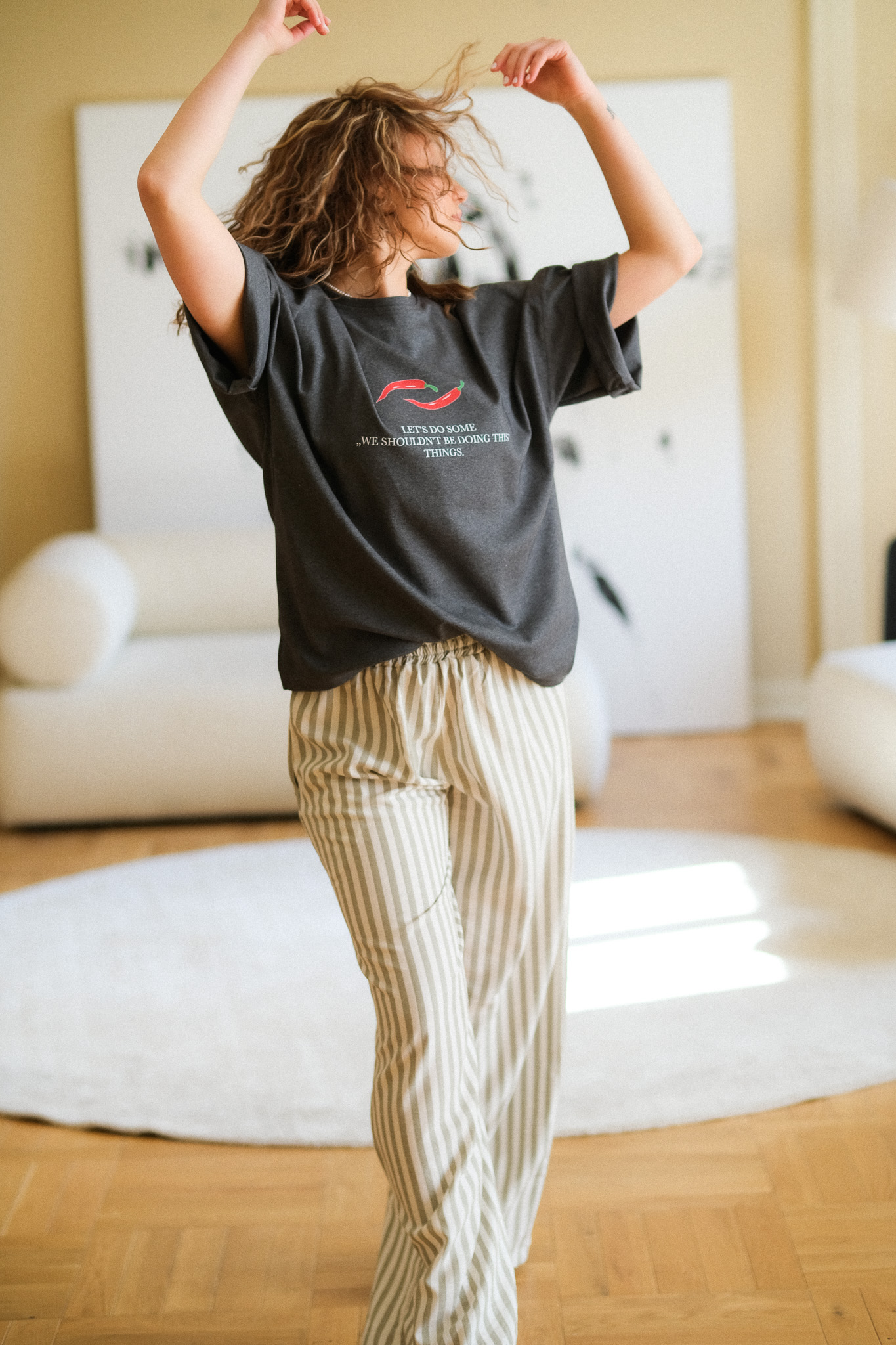 Szeroki, elastyczny pas (guma) sprawia, że spodnie dopasowują się do talii, zapewniając wygodę przez cały dzień – od porannej kawy po wieczorny spacer. Materiał o naturalnym splocie świetnie przepuszcza powietrze, co czyni je idealnym wyborem na cieplejsze dni.