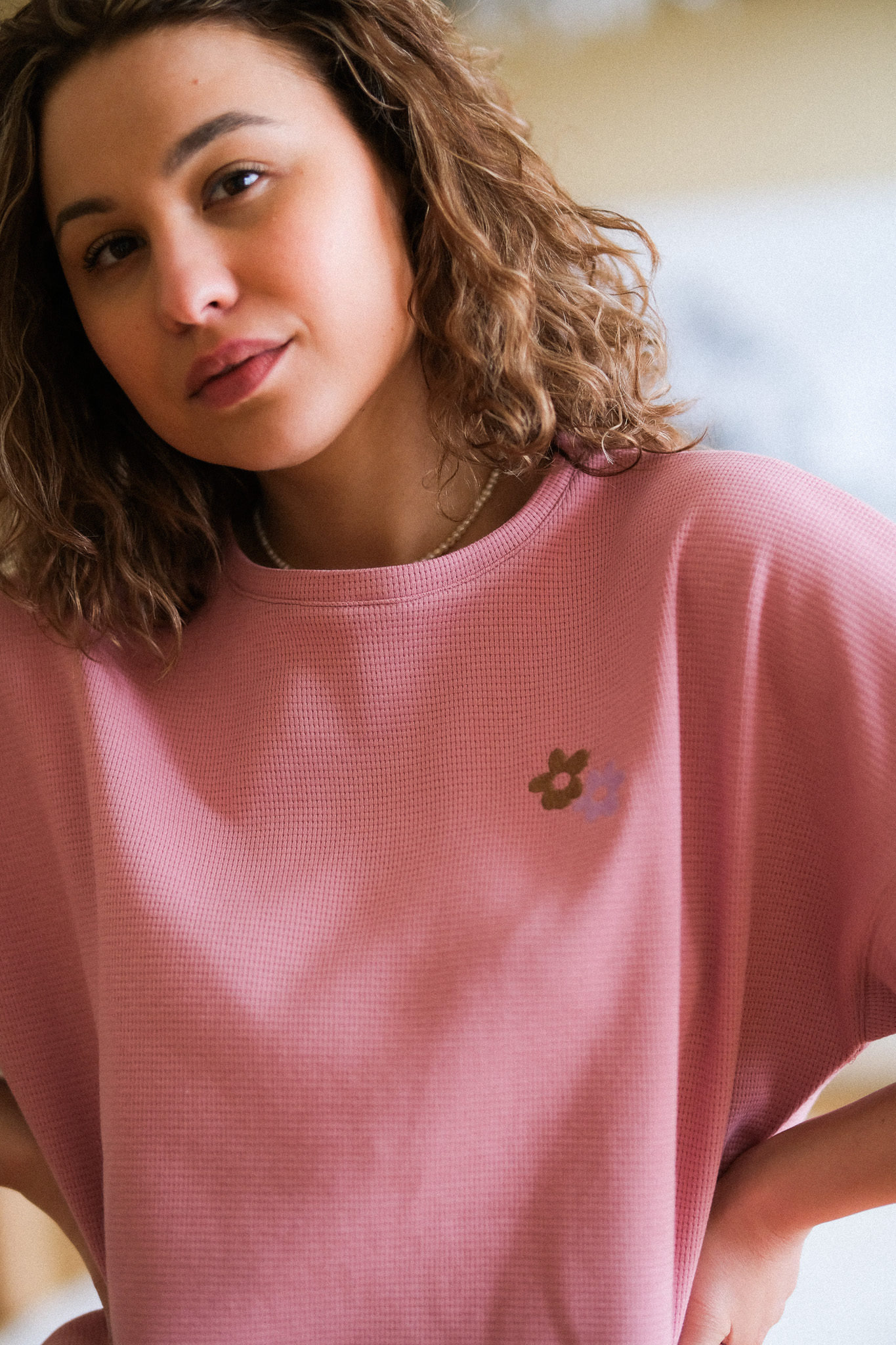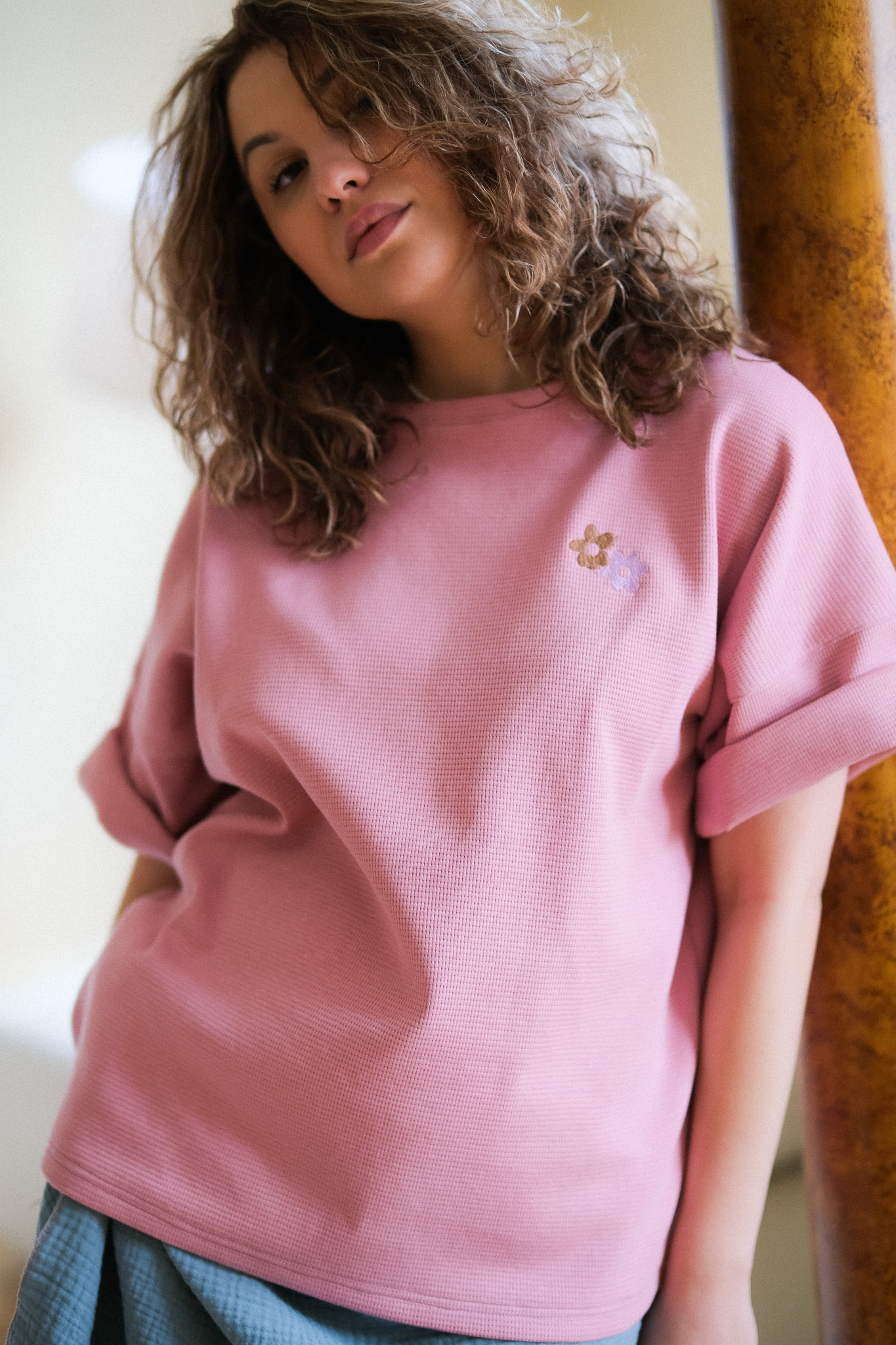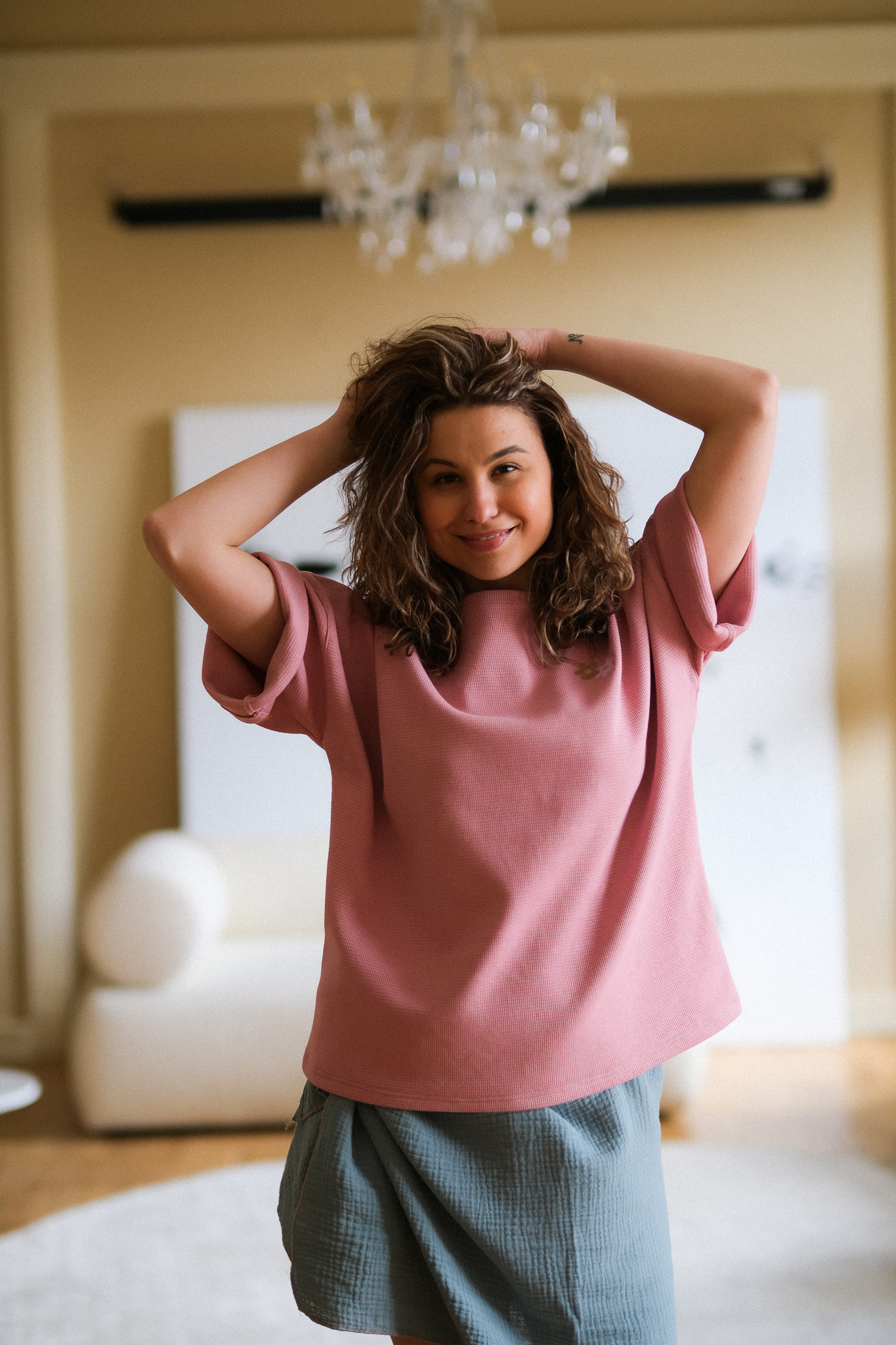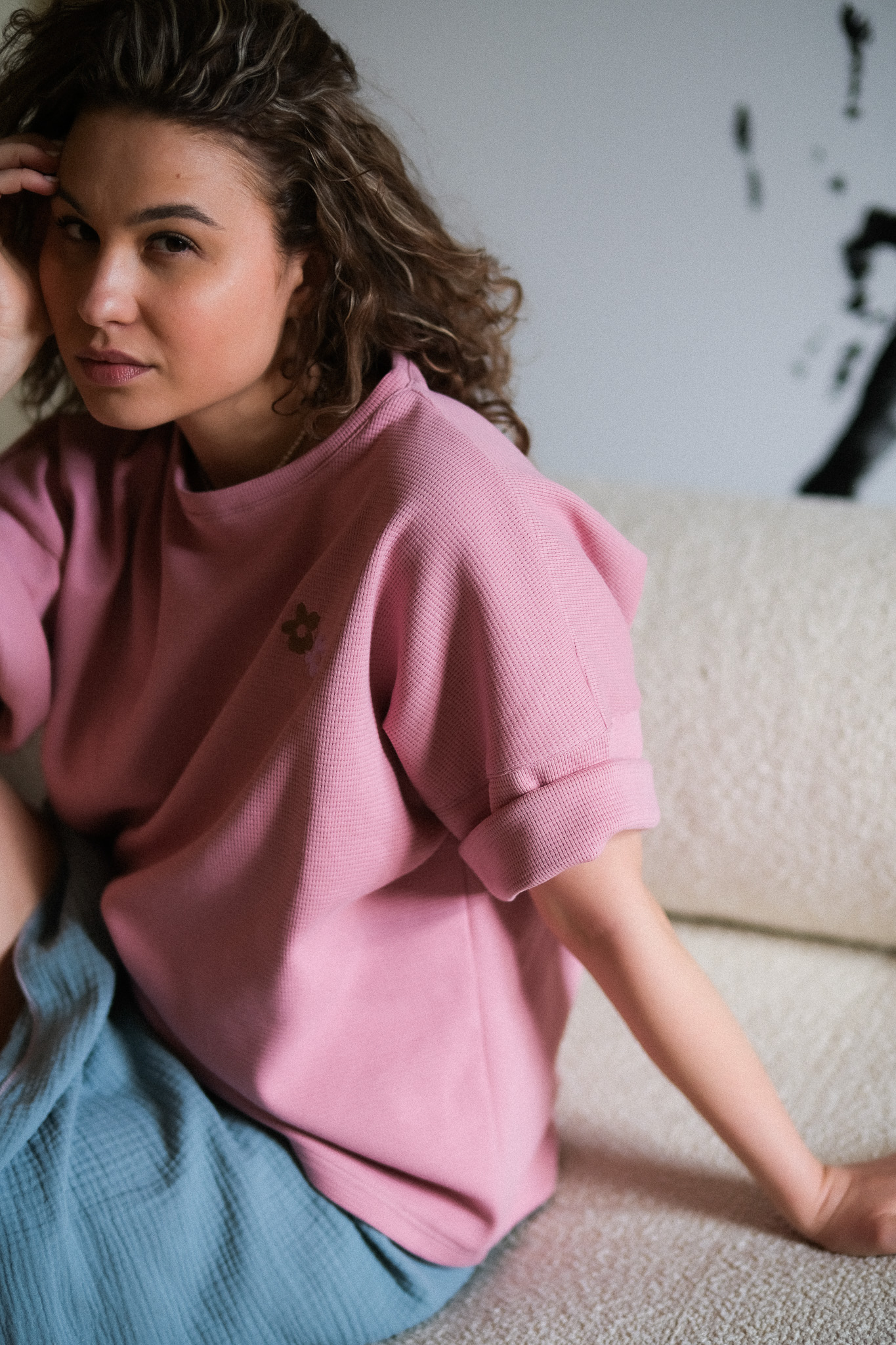 Stylowy powrót do natury. T-shirt “WAFFLE to połączenie niezwykłego komfortu z uroczym, dziewczęcym detalem. Wykonany z mięsistej, prążkowanej dzianiny o strukturze gofra, nie tylko świetnie wygląda, ale jest też niezwykle przyjemny w dotyku, stając się idealną bazą dla Twoich letnich stylizacji.