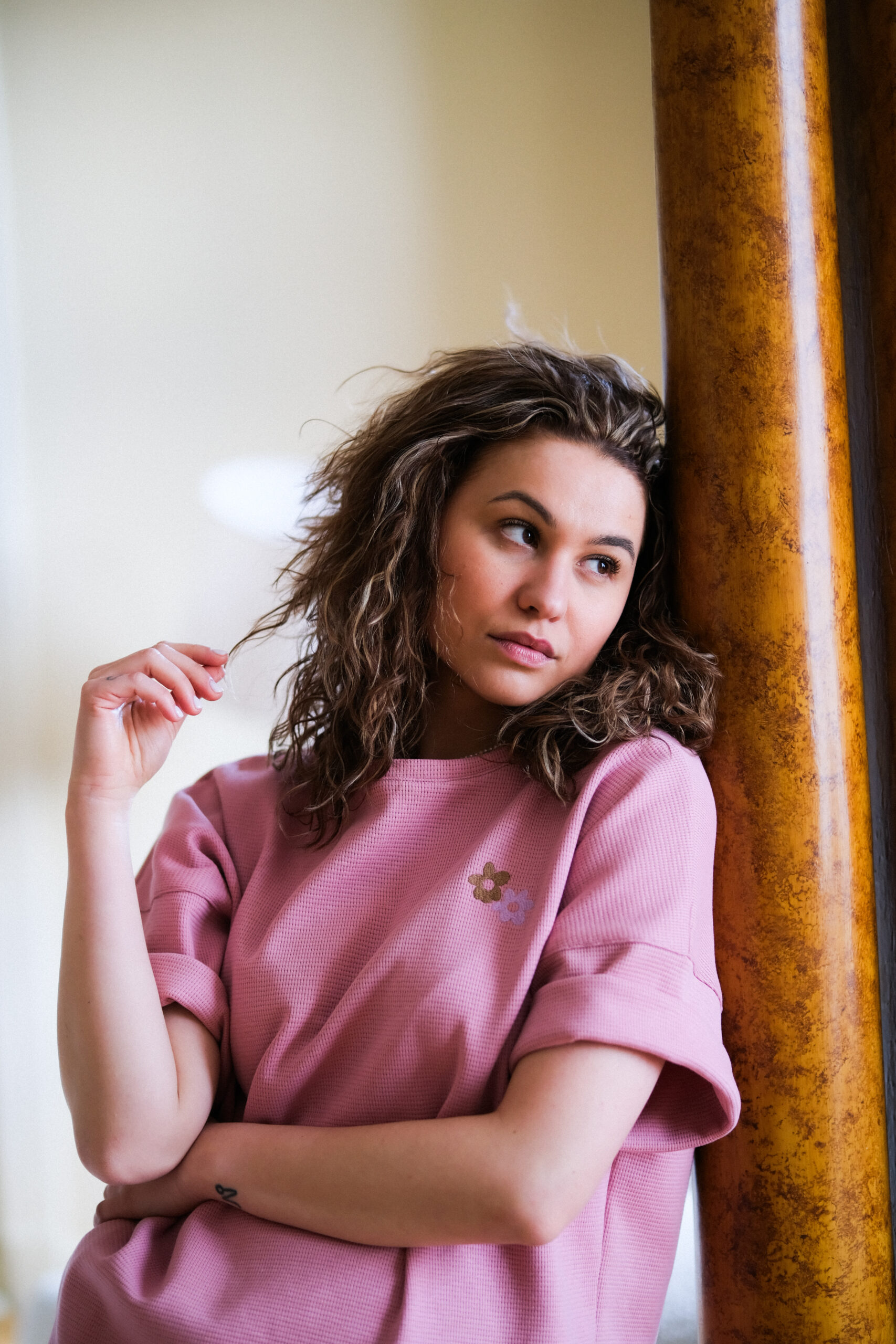 Podwiń rękawy (jak na zdjęciu), aby nadać stylizacji jeszcze więcej luzu. Noś go do naszych różowych szortów, aby stworzyć spójny zestaw, lub przełam jego delikatność, łącząc go z ciemnymi jeansami.